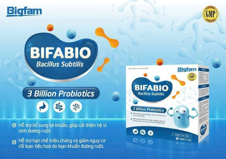 BifaBio là sản phẩm nổi bật đến từ Dược phẩm Bigfa, với công thức chứa Bacillus Subtilis – một chủng lợi khuẩn mạnh mẽ, giúp cân bằng hệ vi sinh đường ruột hiệu quả. Sản phẩm cung cấp 3 tỷ lợi khuẩn mỗi ngày, hỗ trợ tăng cường tiêu hóa, giảm tình trạng rối loạn tiêu hóa và bảo vệ sức khỏe đường ruột một cách tự nhiên.