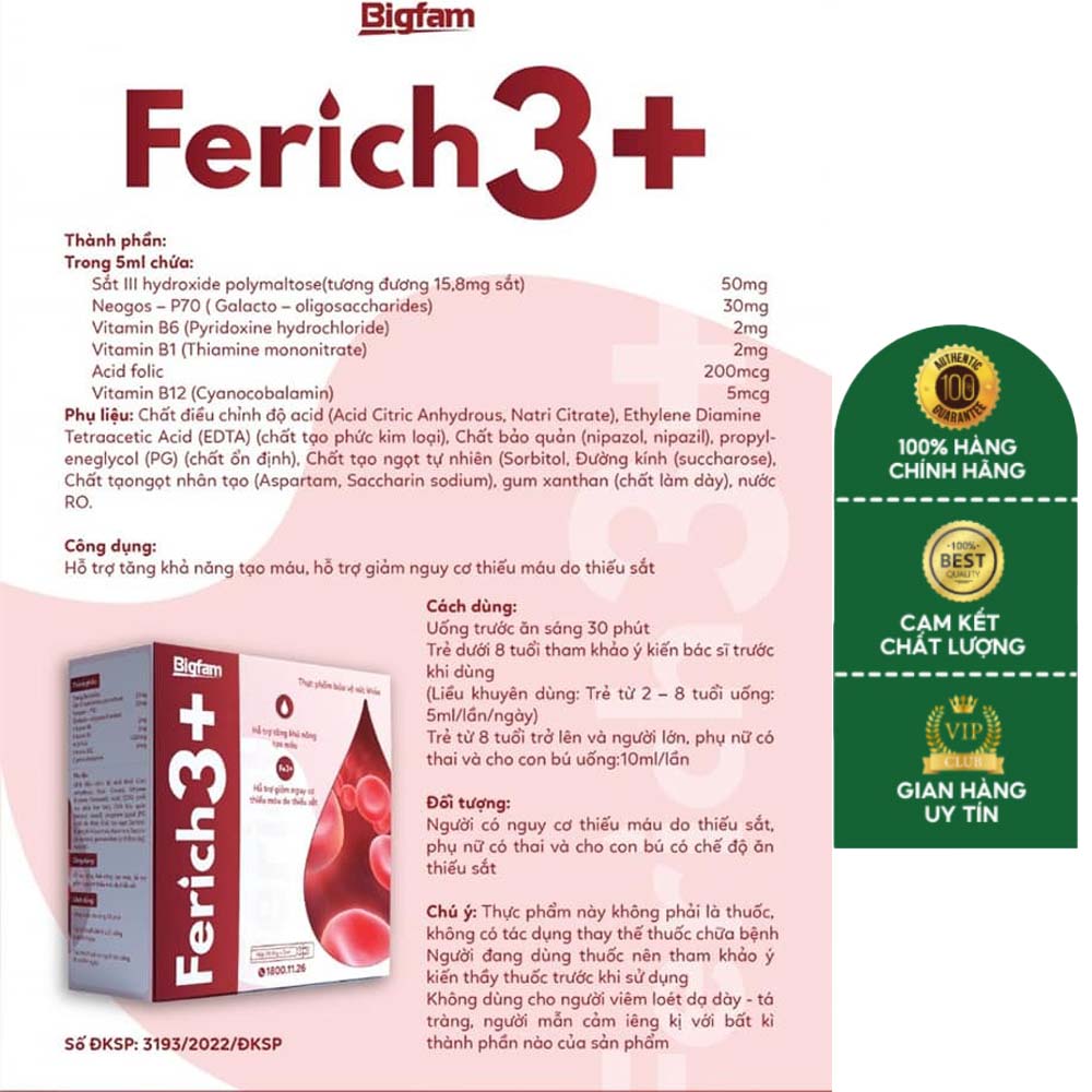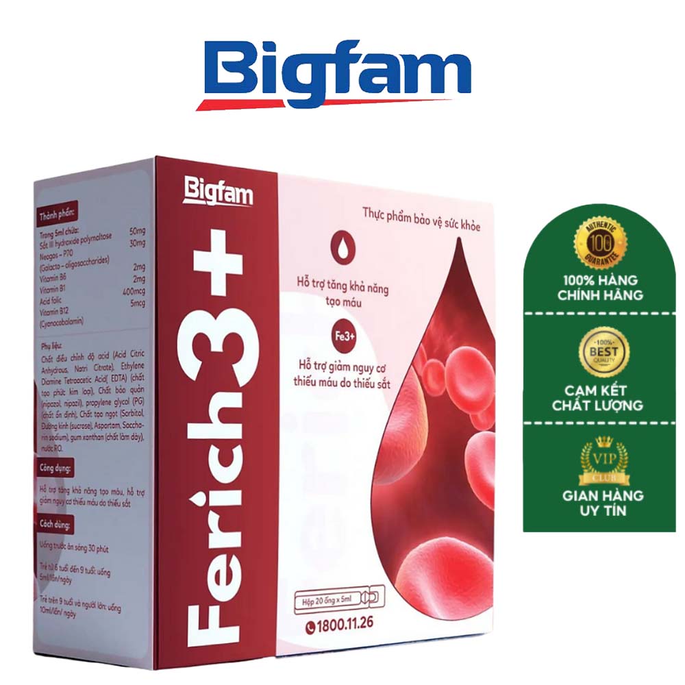 Ferich 3+ là sản phẩm chăm sóc sức khỏe thuộc thương hiệu Bigfam, được nghiên cứu và phát triển nhằm hỗ trợ tăng khả năng tạo máu, bổ sung sắt và giảm nguy cơ thiếu máu do thiếu sắt. Với thành phần chứa sắt hữu cơ dễ hấp thu cùng các vitamin thiết yếu, Ferich 3+ là lựa chọn lý tưởng cho những ai đang gặp vấn đề về thiếu máu hoặc cần tăng cường sức khỏe toàn diện.